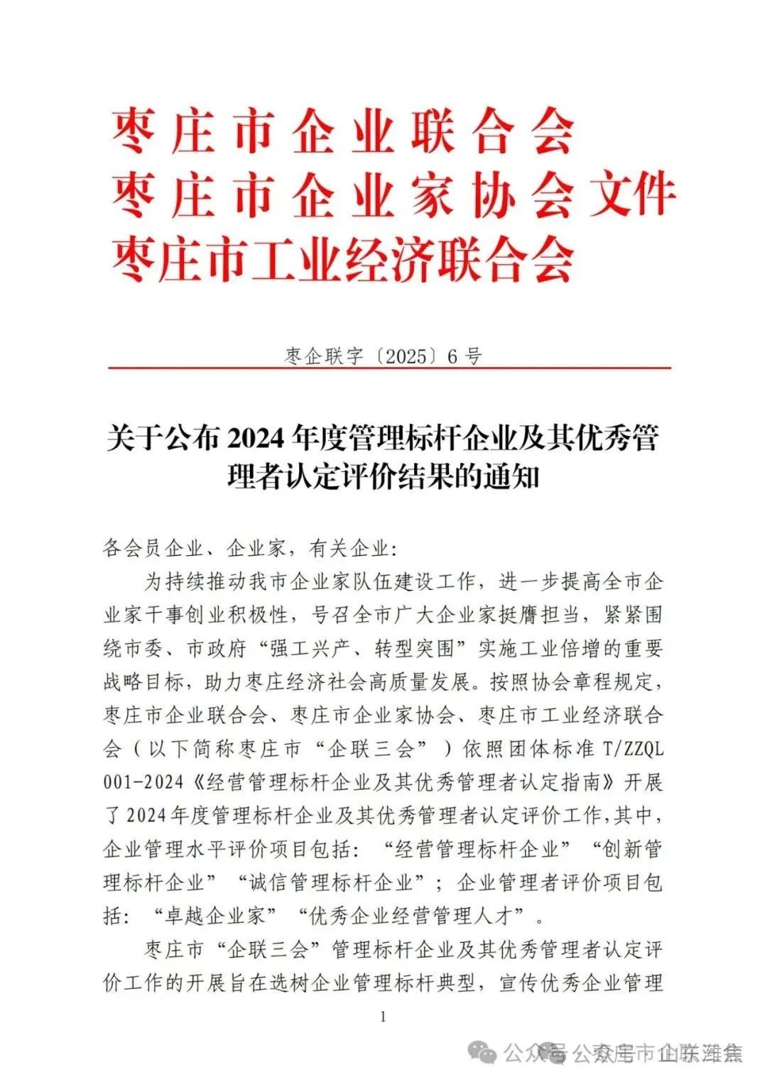 近日,棗莊市企業(yè)聯(lián)合會、棗莊市企業(yè)家協(xié)會、棗莊市工業(yè)聯(lián)合會發(fā)布《關(guān)于2024年管理標(biāo)桿企業(yè)及其優(yōu) 秀管理者認(rèn)定評價結(jié)果的通知》,山東濰焦集團薛城能源有限公司、棗莊杰富意振興化工有限公司榮獲2024年度“經(jīng)營管理標(biāo)桿企業(yè)”稱號。這是對兩公司經(jīng)營管理水平、管理創(chuàng)新能力等方面的充分肯定和認(rèn)可。